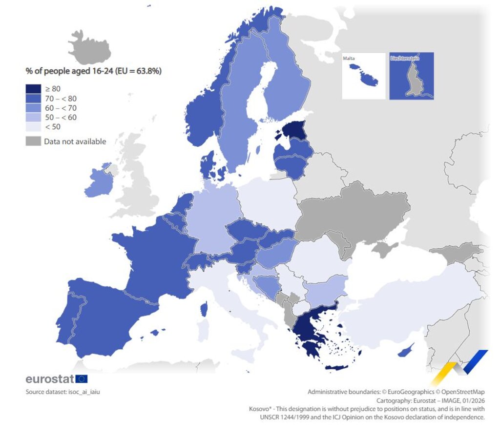 Сред страните от ЕС най-високият дял на хората на възраст 16-24 години, използващи инструменти за генеративен изкуствен интелект, е регистриран в Гърция (цели 83,5%), Естония (82,8%) и Чехия (78,5%). Най-ниският дял е в Румъния (44,1%), Италия (47,2%) и Полша (49,3%) и България (49,98%).
