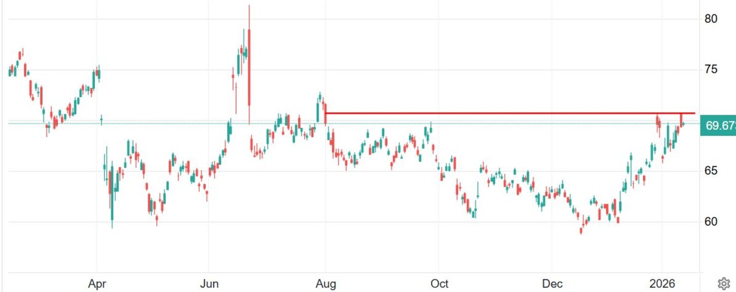 Към 10.40 часа фючърсите на петрол Брент се повишават с 0,45% към 69,70 долара за барел, след като вчера поскъпнаха за кратко към 70,72 долара за барел (най-високо ниво от 1-ви август 2025 г.). Аналогичните фючърси на американския лек суров петрол WTI поскъпват с 0,53% към 65 долара за барел, отправяйки поглед към близо 6-месечни връх около 66,48 долара за барел от 29 януари 2026 г.