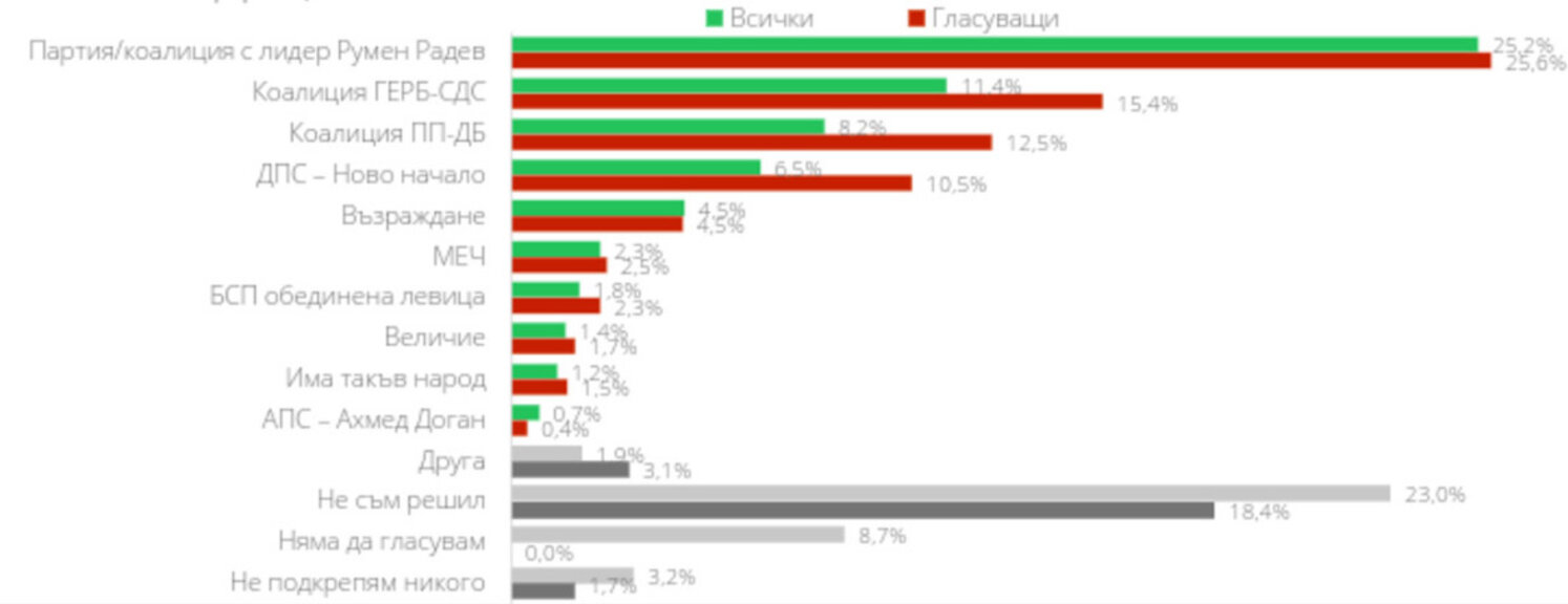 Партия на Радев - първа с 25 %, ПП-ДБ трета - 12,5 %, "Възраждане" - около чертата на изпадане.