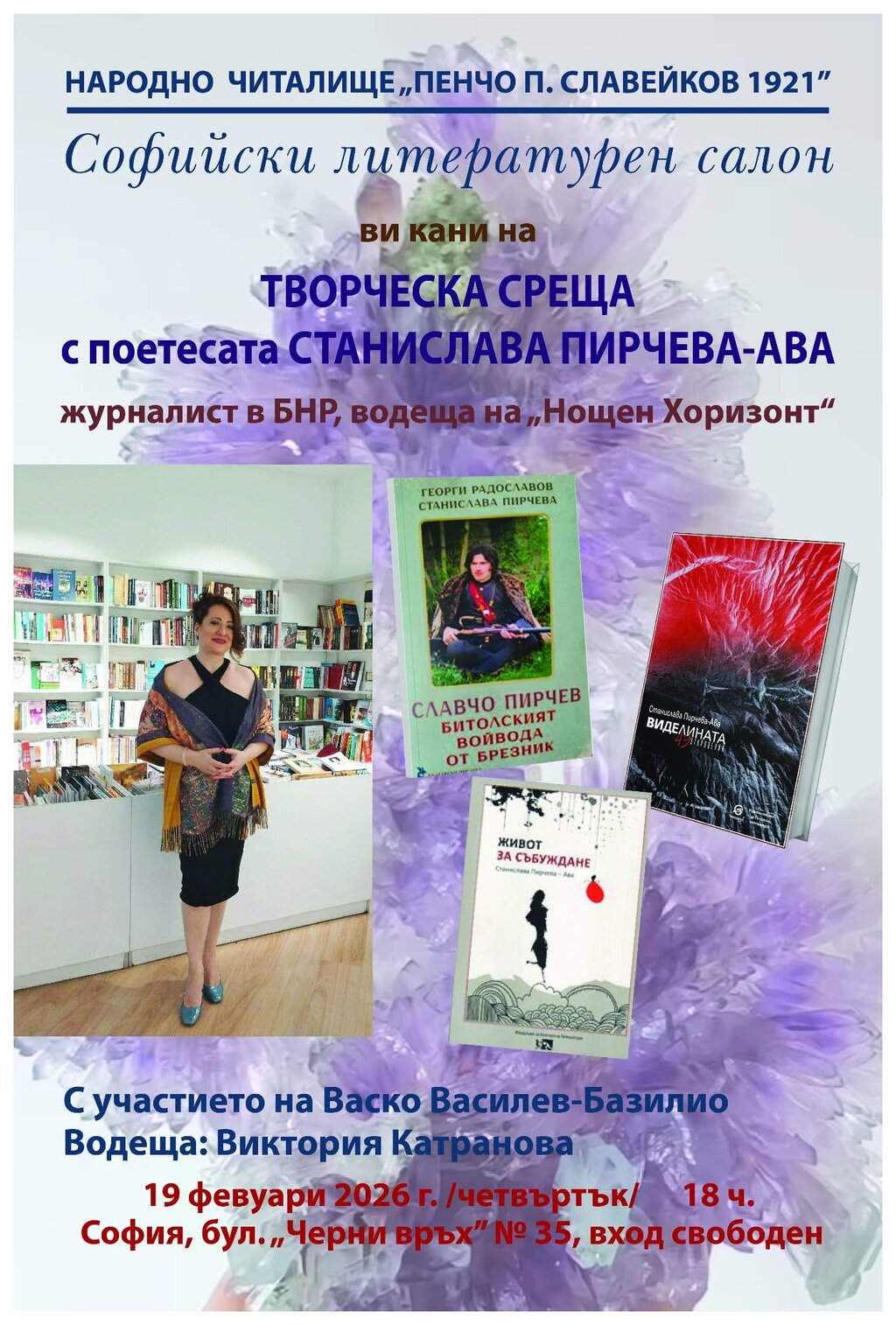 Днес от 18 часа в Народно читалище „Пенчо П. Славейков 1921“ на бул. "Черни връх" 35 колежката от БНР, водеща на "Нощен Хоризонт" по програма "Хоризонт" Станислава Пирчева ни кани на творческа среща с поезията, паметта и думите.