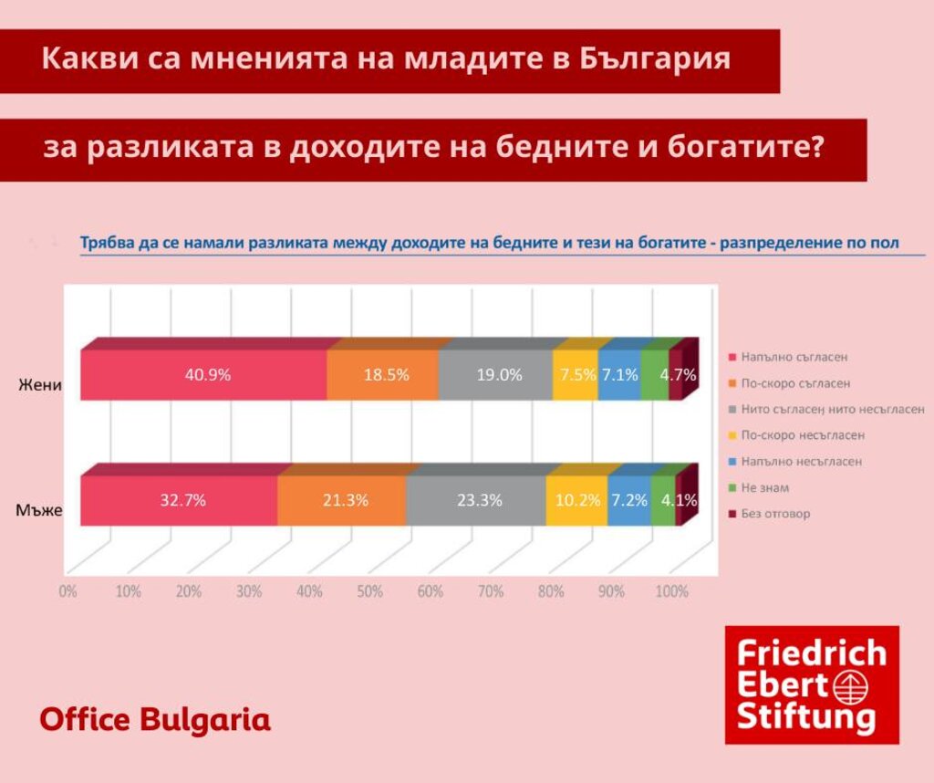 Младите жени в България демонстрират по-голяма нетърпимост към социално-икономическите неравенства от младите мъже. Те изразяват и далеч по-силна подкрепа за политики, насочени към социално-икономическо равенство.