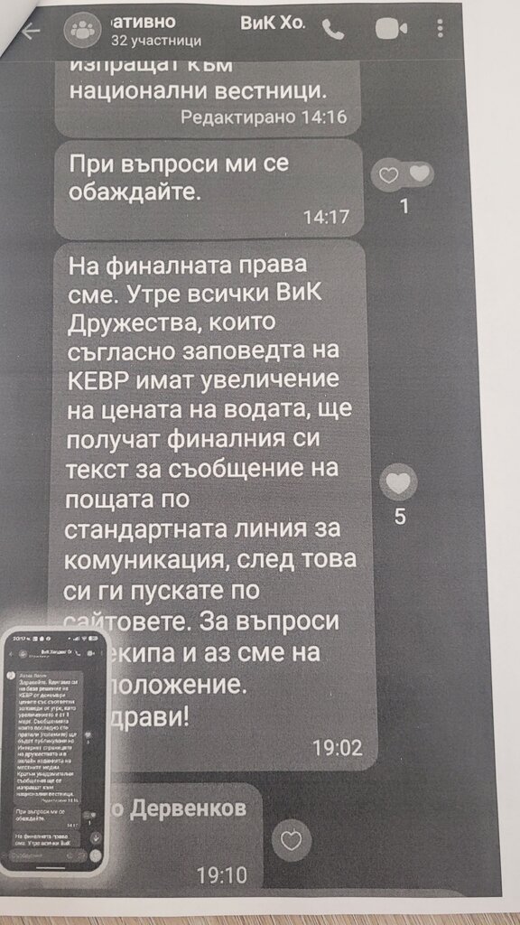 "Премиерът Гюров зададе въпроса кой е координирал това вдигане на цените, докато министърката е била в Брюксел. Аз ще ви отговоря кой е координирал това вдигане на цените. Този, който е координирал вдигането на цените, който понастоящем е и координатор, областен, на "Продължаваме промяната" в Хасково - партията на Андрей Гюров. Казва се инж. Лозко Лозев и е председател на Управителния съвет на Българския ВиК холдинг. Това е кореспонденция между него и всички ВиК управители в страната от вчера и от онзи ден", коментира той.