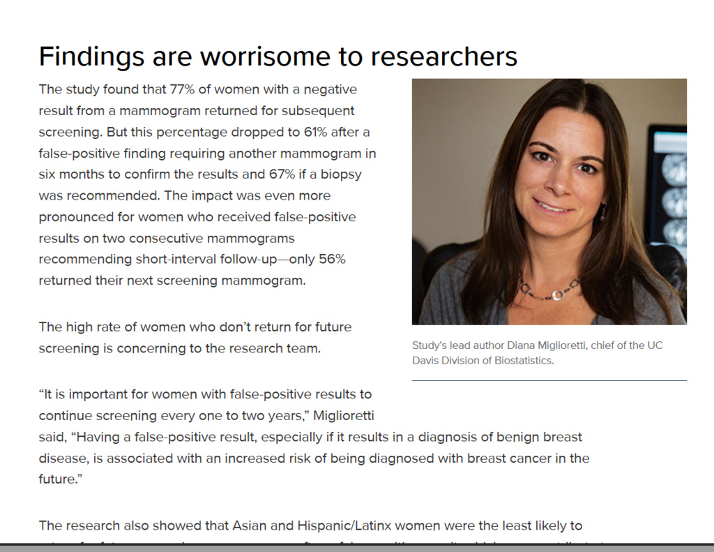 Статия в сайта на Националния раков институт (National Cancer Institute – NCI) на САЩ разглежда мащабно изследване върху това как фалшиво положителните резултати от мамография влияят на бъдещото поведение на жените относно профилактичните прегледи.