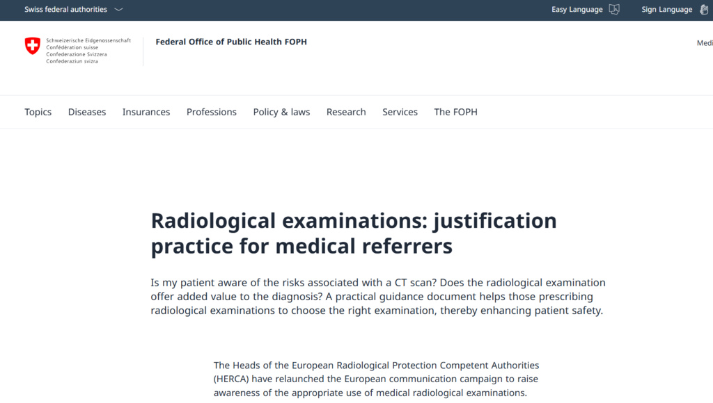 Федералната служба за обществено здраве (FOPH) в Швейцария отговаря за националната здравна политика, за здравното застраховане и застраховането срещу злополуки. Институцията играе ролята на министерство на здравеопазването – определя медицински услуги се покриват от задължителната застраховка, управлява национални кампании срещу заразни болести и за здравословен начин на живот, контролира безопасността на храните, химикалите – включително радиационната защита. Становище на институцията по темата призовава към контролирано и добре обосновано прилагане на изследвания, свързани с радиационно облъчване.