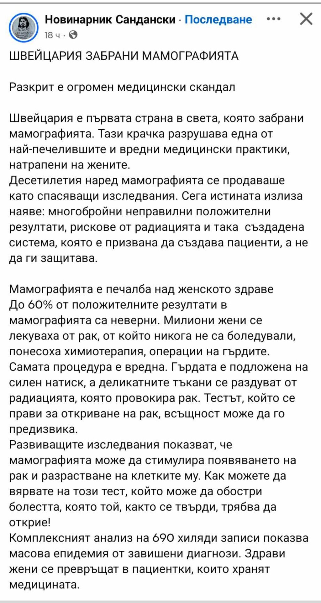 В социалните мрежи стана популярна публикация, която гласи, че Швейцария е забранила мамографията. Според разпространената информация "до 60% от положителните резултати в мамографията са неверни", а самата процедура е "вредна и стимулира развитието на ракови клетки".