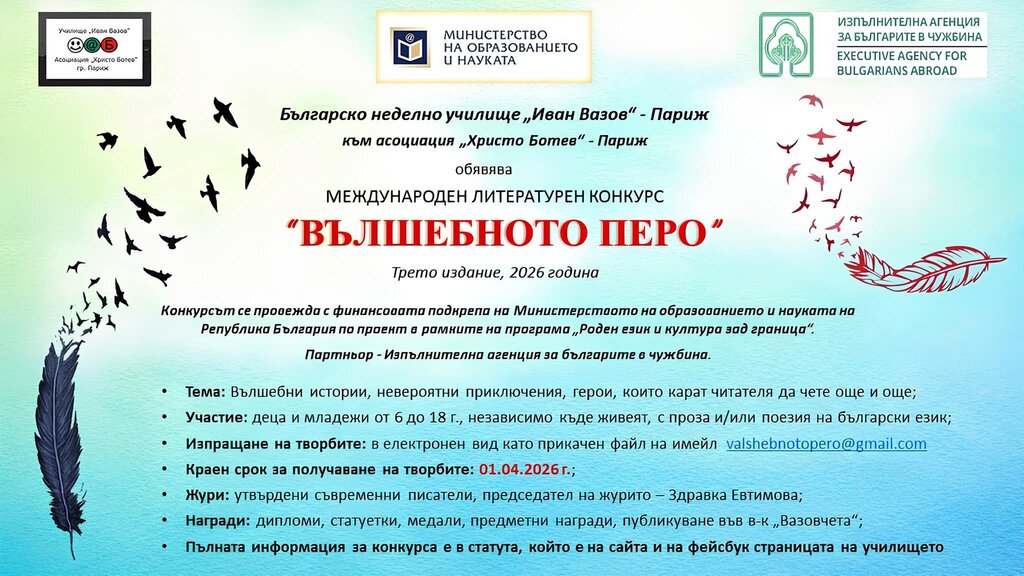Българското неделно училище "Иван Вазов" в Париж обяви условията на третото издание на Международния литературен конкурс "Вълшебното перо", 2026.
