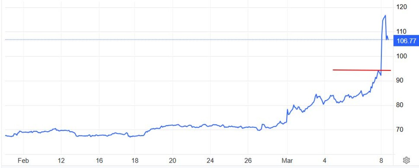 Срещата идва на фона на скока на цените на петрола с над 25% по-рано в понеделник, доближавайки 120 долара за барел - най-високите нива от първата половина на 2022 г., тъй като някои големи производители в Близкия изток намалиха производството и доставките, а разрастващата се война между САЩ и Израел с Иран засили опасенията от продължителни прекъсвания на корабоплаването в региона и по-специално през Ормузкия проток.