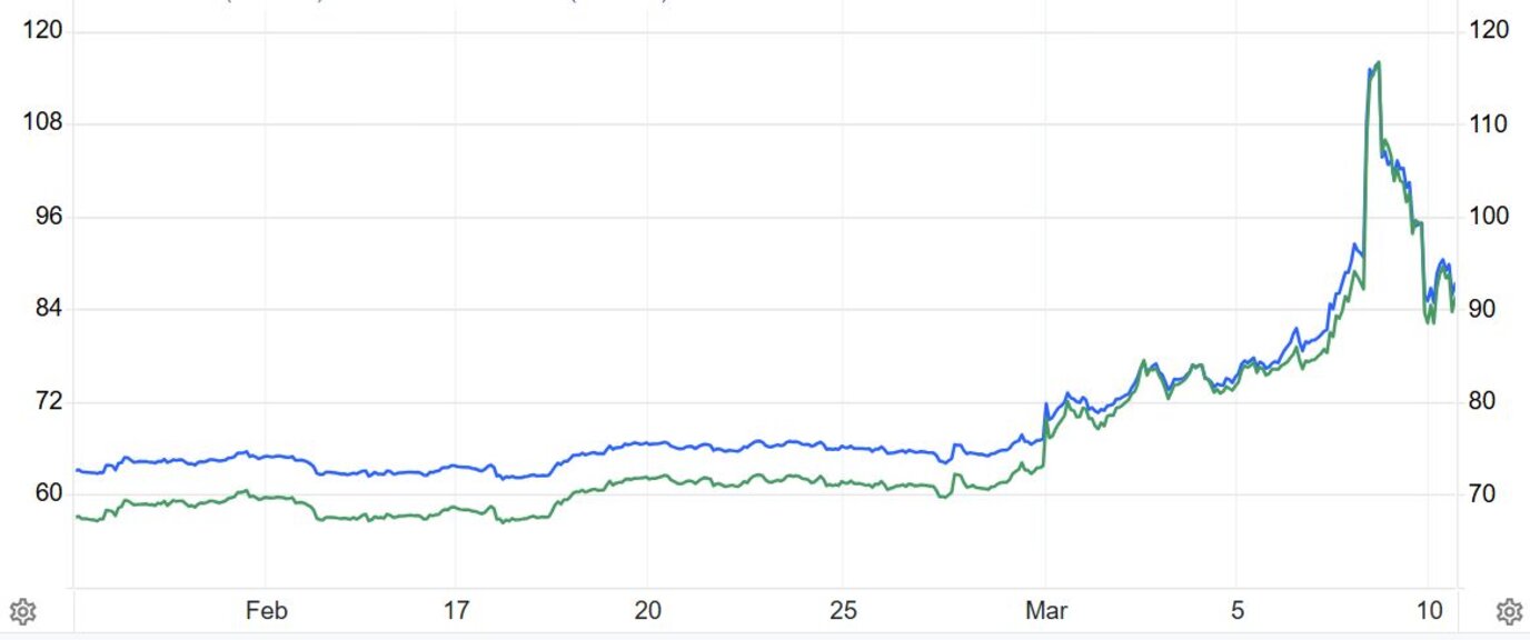 Към 10.00 часа българско време фючърсите на петрол Брент се понижават с 8,9% към 90 долара за барел, а тези на американския лек суров петрол WTI - с 9,3% към 86 долара за барел, заличавайки изцяло вчерашното драматично поскъпване до над тригодишни върхове към 119,50 долара за барел.