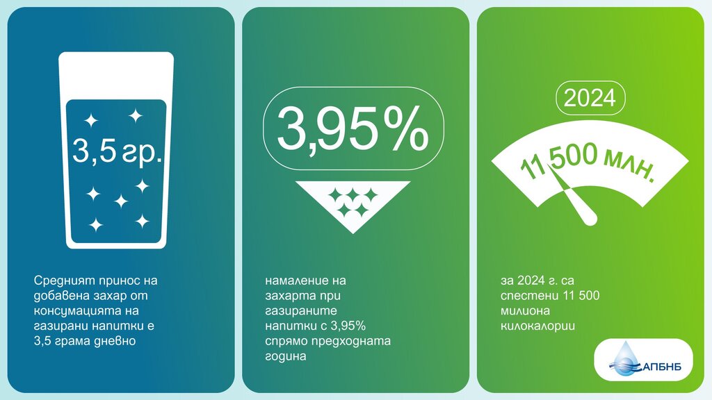 Индустрията за безалкохолни напитки и бутилирани води е първият сектор от българската хранително-вкусовата промишленост, ангажирал се доброволно и дори преизпълнил конкретната цел в призива на ЕС за доброволно намаляване на добавените захари с 10% до 2020 г. В нейното изпълнение секторът отчете намаляване с 15,21% на внесената вхранителния режим захар от газираните напитки. Независимо експертно проучване за калоричността на реализираните на българския пазар безалкохолни напитки за периода 2015 – 2020 г. показа нарастване на дела на газираните напитки без захар (с 2,65%), както и 6,7% средно намаление на захарта на 100 ml в напитките от категорията, в чийто състав има добавена захар.