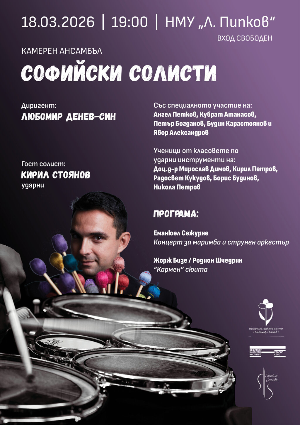 На 18 март в концертната зала на Националното музикално училище в София, ден преди рождения си ден, "Софийски солисти" ще представят една интересна и ефектна програма, посветена на ударните инструменти. Тя ще започне с Концерта за маримба и струнен оркестър от Еманюел Сежурне в оригиналната му двучастна версия. Солист ще бъде Кирил Стоянов, който от години е тимпанист на Филхармонията в Братислава, участва в десетки солови проекти не само в Словакия, но и в Австрия и Германия.