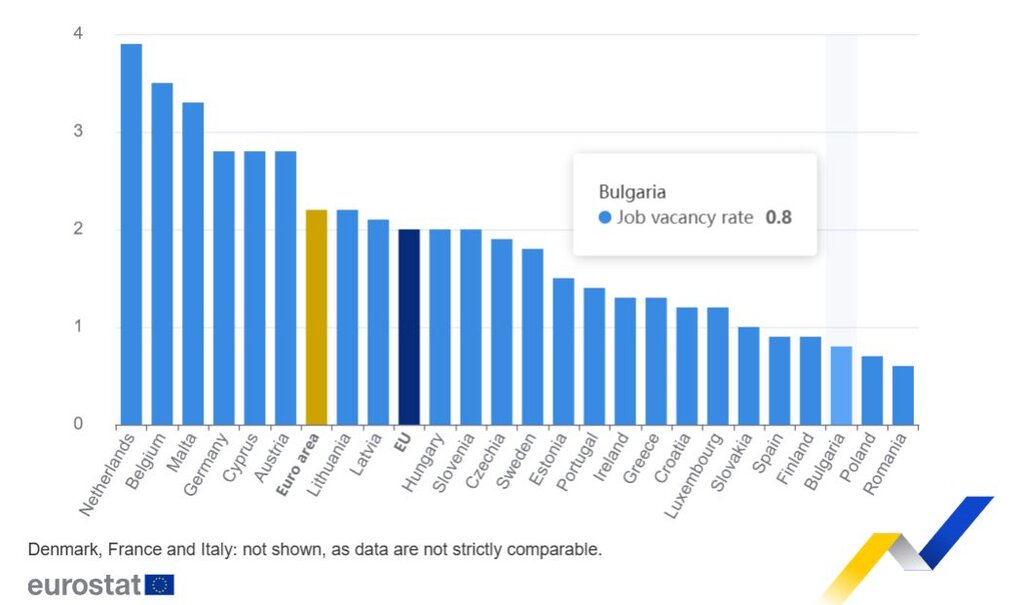 В България процентът на незаетите работни места остана в края на 2025 г. за второ поредно тримесечие на ниво от едва 0,8%, като по-ниско ниво беше отчетено в Румъния (0,6%) и Полша (0,7%).