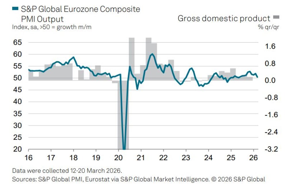 Общият PMI индекс на S&P Global, включващ активността в промишлеността и сферата на услугите, се понижи до 50,5 пункта от 51,9 пункта през февруари, докато пазарните очаквания бяха за индекс на ниво от 51,0 пункта. Въпреки че икономическата активност продължава да се разширява за 15-и пореден месец (индекс над важното ниво от 50,0 пункта), това е най-слаба бизнес експанзия в еврозоната от май 2025 г. насам.