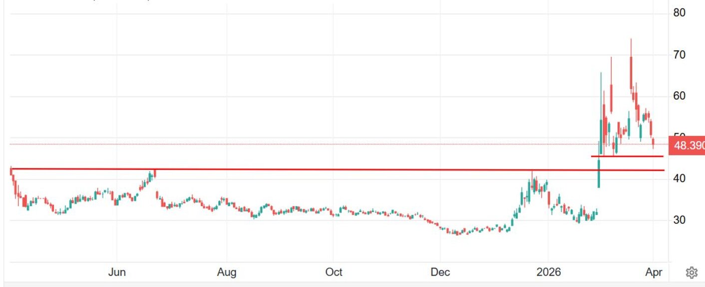 Към 10.30 часа българско време газовите фючърси с доставка през май се търгуват на нидерландската борса TTF с понижение от 4,7% към €48,30/MWh, като за кратко удариха часово дъно към 47,30 евро за пръв път от 11 март насам.