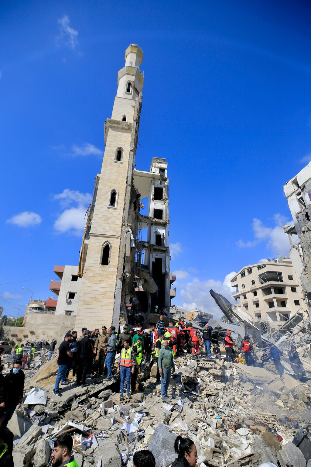 Спасители издирват оцелели в комплекса Фатима ал-Захраа в Сидон, Ливан, 8 април 2026 г. Няколко души бяха убити при удара, включително свързаният с "Хизбула" шейх Садик Ал-Набилси.