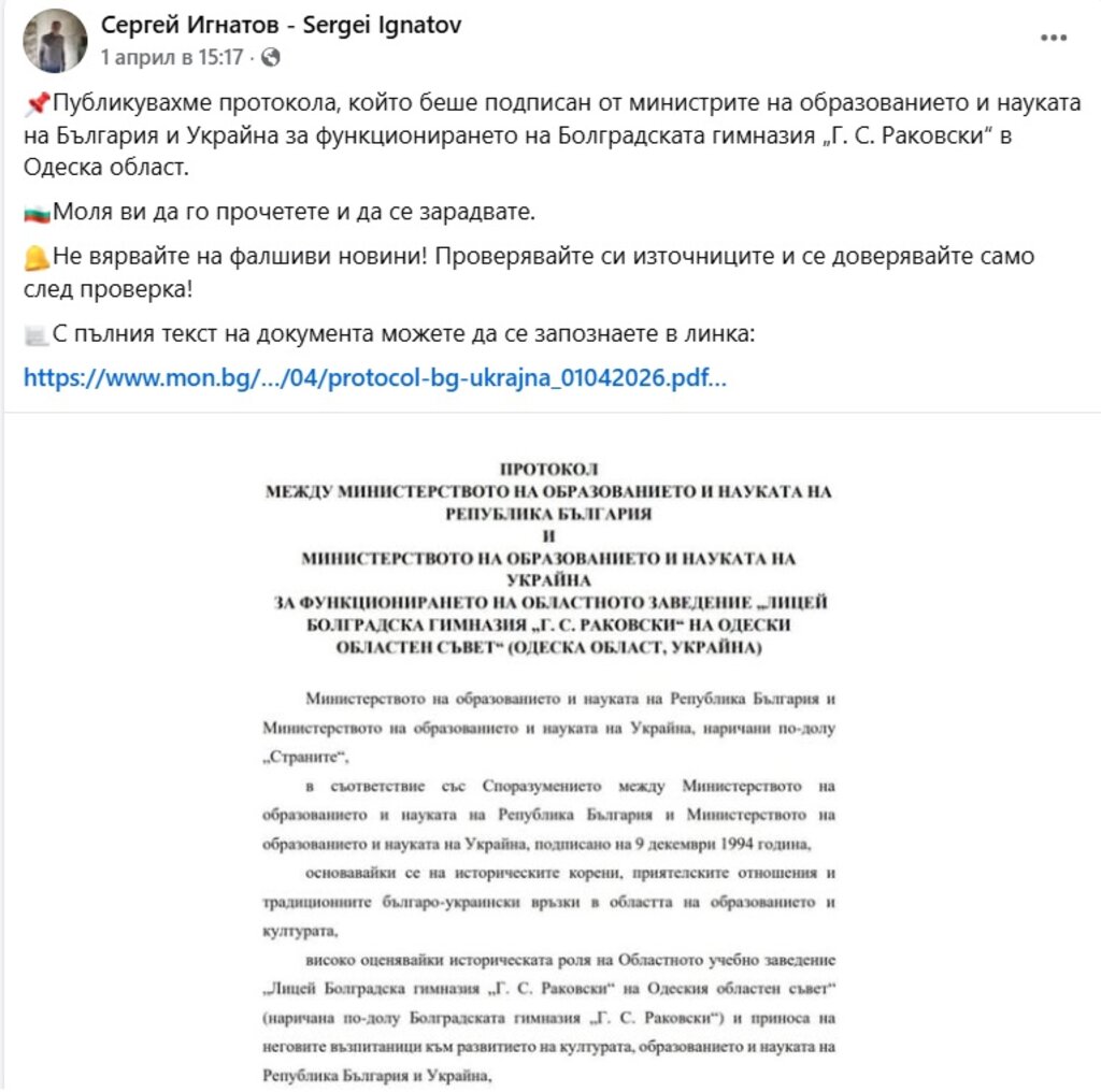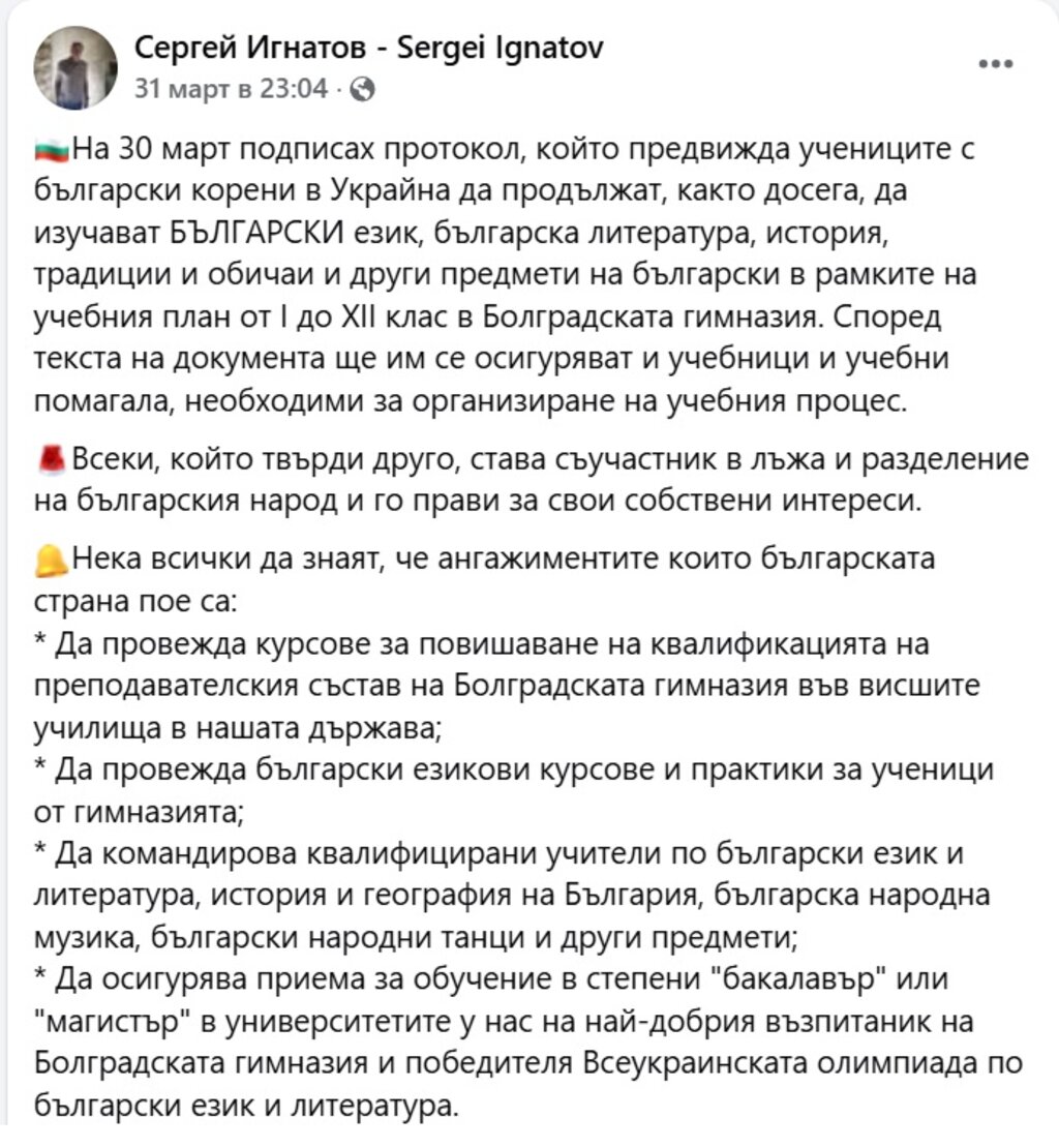 Сергей Игнатов излезе и с две свои публикации във Фейсбук – на 31 март и на 1 април, в които описва, че е подписал протокол, "който предвижда учениците с български корени в Украйна да продължат, както досега, да изучават български език, българска литература, история, традиции и обичаи и други предмети на български в рамките на учебния план от I до ХII клас в Болградската гимназия.