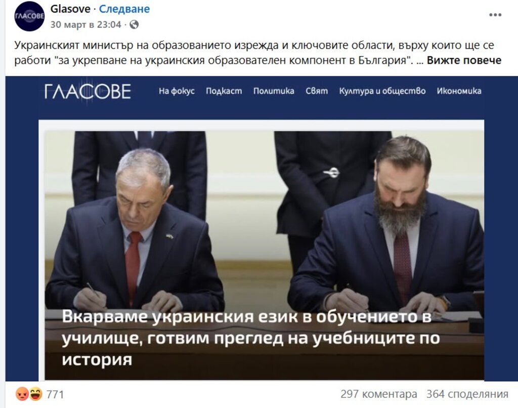 В различни публикации от края на март и началото на април се твърди, че България е подписала документ, който предвижда изучаване на украински като официален чужд език в българските училища.