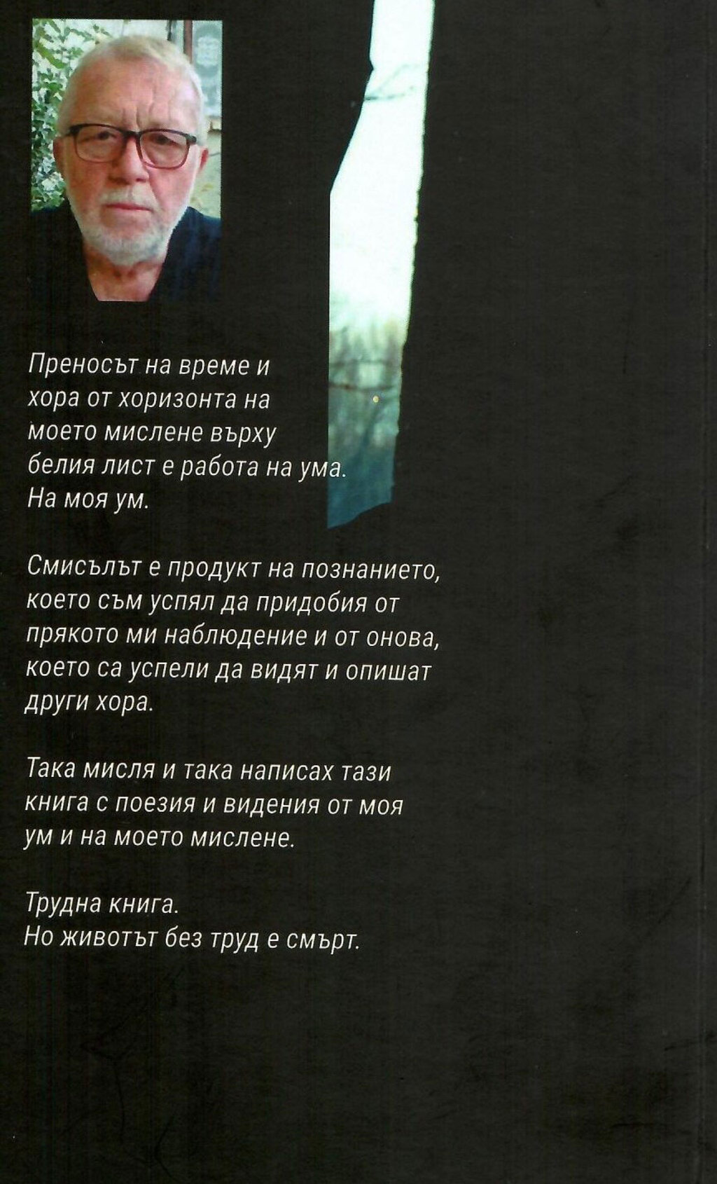 Така мисля и така написах тази книга с поезия и видения от моя ум и на моето мислене, в деликатна близост до разбирането ми за единствения и недостижим Съвършен разум.