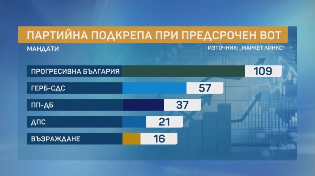 Първа в допитванията сред избирателите е "Прогресивна България" с 30,8% подкрепа, втори са ГЕРБ-СДС с 18%, трети са ПП-ДБ с 11,2 на сто, четвърти са "ДПС-Ново начало" с 6,5%, а пети – "Възраждане" с 4,2%.