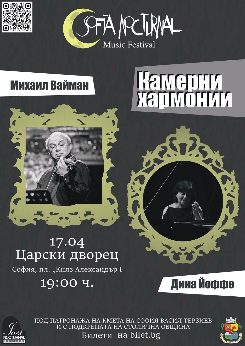 Началото ще поставят двама големи авторитети от международната сцена - пианистката Дина Йофе (лауреат на конкурсите "Фредерик Шопен" и "Роберт Шуман") и цигуларят Михаил Вайман (носител на втора награда в международния конкурс "Хенрик Виенявски"). Техният концерт е на 17 април от 19:00 ч. в Националната художествена галерия - в Балната зала на Двореца. Дуото ще представи пред софийската публика сонати за цигулка и пиано от Моцарт и Равел, а втората част ще бъде посветена на Шопен - със Соната и Голямо дуо концертанте в транскрипция за цигулка и пиано на Михаил Вайман.