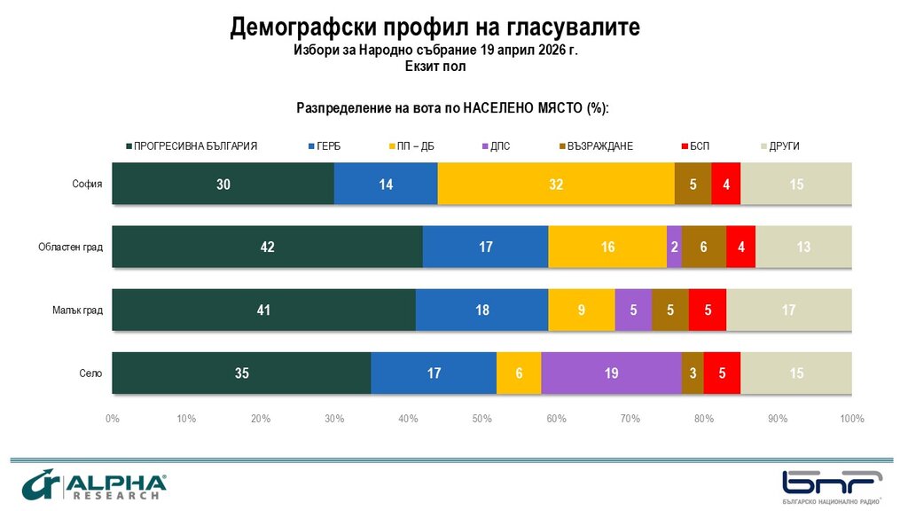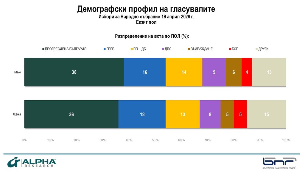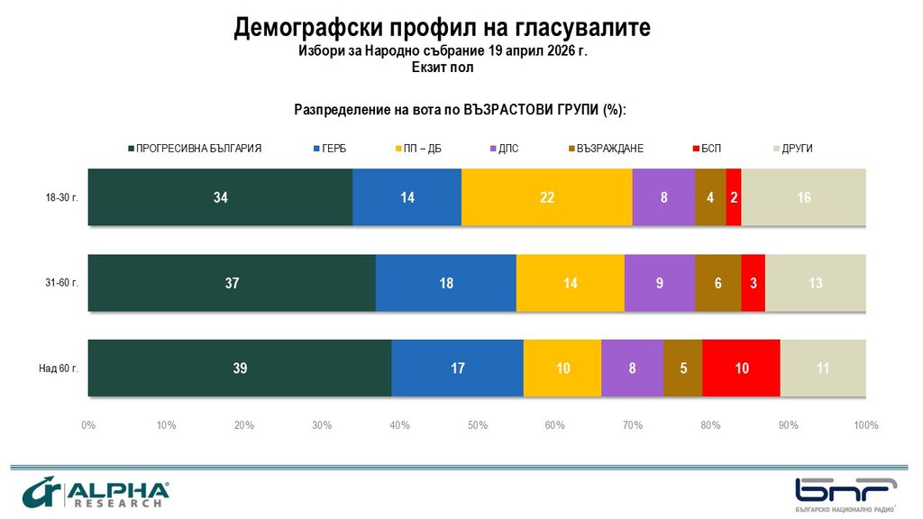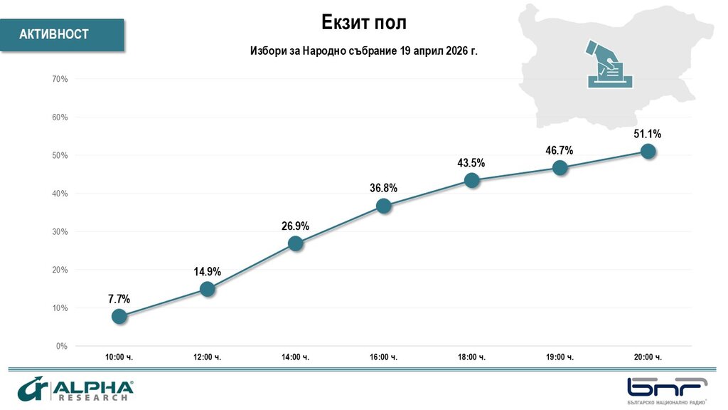 Екзитпол към 20:00 часа на "Алфа Рисърч", с която БНР си партнира в днешния изборен ден, сочи, че "Прогресивна България" е първа политическа сила с 38,1%. Втора си ГЕРБ-СДС - 15,9%, а трети ПП-ДБ - 14,1%.