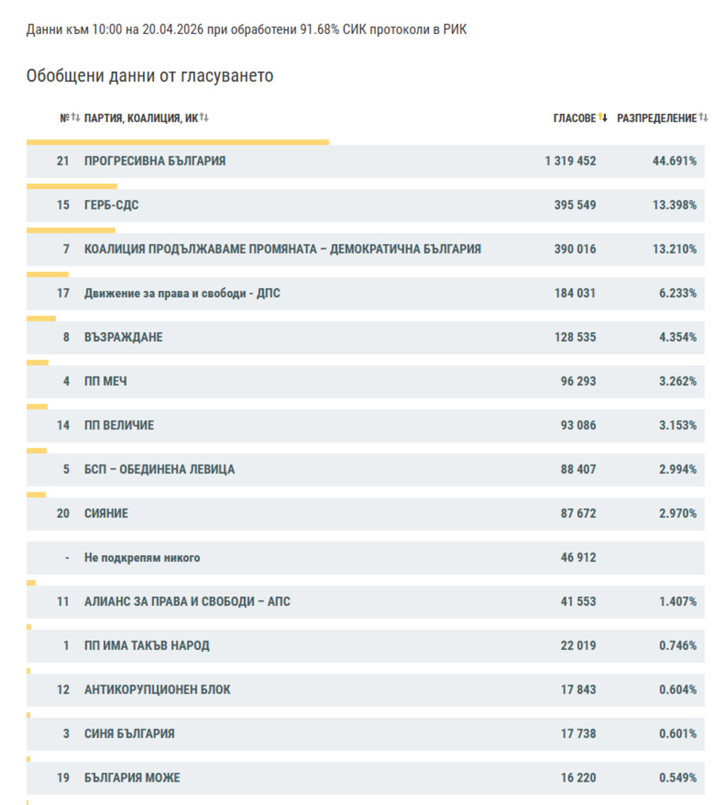 При 91,68% обработени секционни протоколи от предсрочните парламентарни избори "Прогресивна България" получава 44,69% от вота, показват данните на ЦИК.