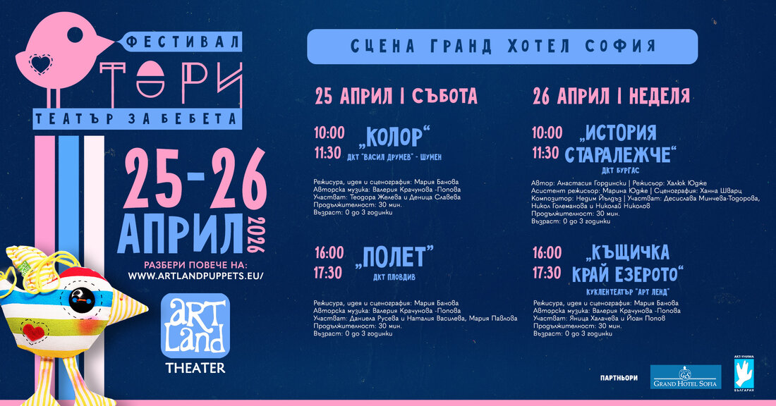 Започва тазгодишното издание на фестивала с театър за най-малките "Тори", който представя серия от театрални спектакли, предназначени за най-малките зрители в рамките на фестивала. Днес (25 април) и утре ще можете да гледате най-актуалните куклени заглавия на театрите в Шумен, Бургас, Пловдив и София, които са подходящи за зрители на възраст между 6 месеца и 3 години. Мястото е един от големите столични хотели на улица "Генерал Гурко" №1. Фестивал на сетивата, експресия от цветове, музика, форми и танц, кукли и много усмивки. Театралните представления имат и своята много важна мисия да запознаят най-малките зрители с магията на изкуството и да открият пред тях нови светове, чрез сензорни преживявания, които, както знаем, са от голямо значение за тяхното развитие. Инициатор на събитията е Мария Банова. Тя е от театър "Арт лент" и е автор и режисьор на повечето бебешки спектакли, които ще може да гледате на фестивала.