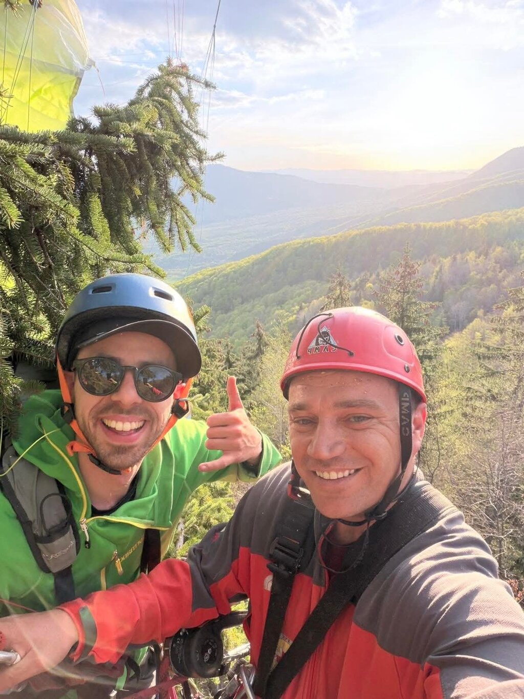 "Няма травми, добре е, в добро здравословно състояние е. Свален е от дървото, придружен е. Там имаше негови приятели, с които заедно практикуват този спорт. Всичко е благополучно", каза Антони Божков от спасителния отряд в Кюстендил.