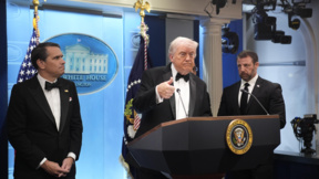 Президентът на САЩ Доналд Дж. Тръмп даде брифинг на пресата, след като пред балната зала на хотел "Вашингтон Хилтън", домакин на вечерята на Асоциацията на кореспондентите на Белия дом, бяха произведени изстрели, 25 април 2026 г.