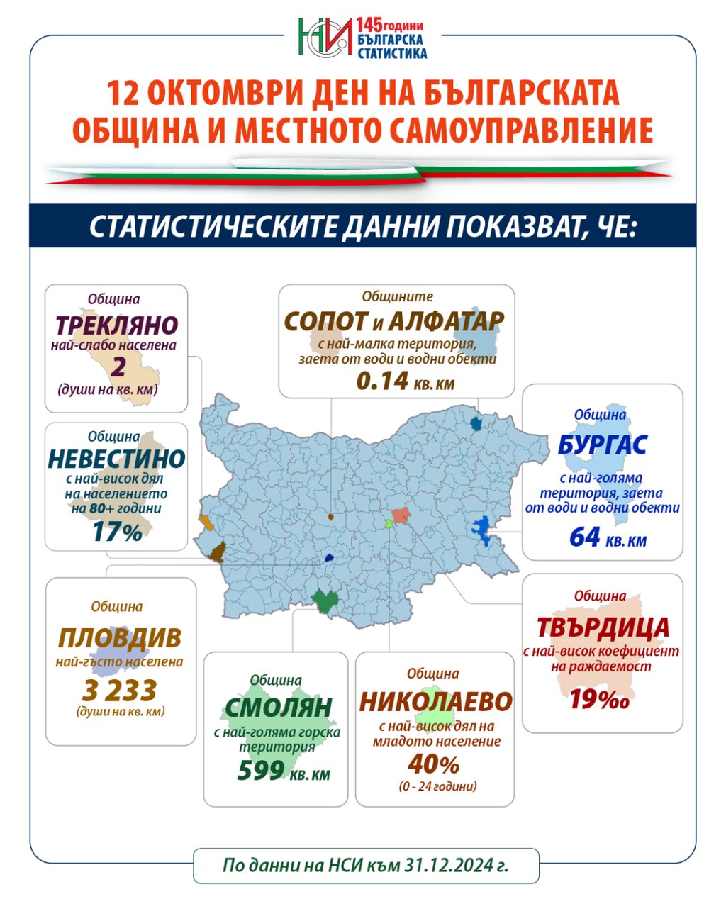 На 12 октомври се отбелязва Денят на българската община и местното самоуправление. Датата носи символиката на първия Закон за общините и градското управление, приет на същия ден през 1882 година в Княжество България. С този закон се регламентира за първи път устройството и дейността на местните органи на държавната власт – общинските съвети, кметовете и техните помощници.