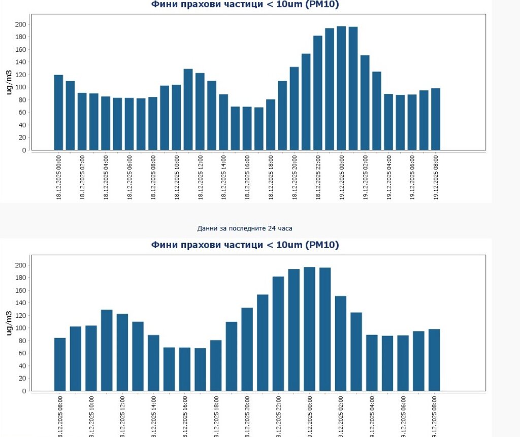 В другата измервателна станция – „Каменица“, стойностите на фините прахови частици доближават 200 микрограма на кубичен метър също около полунощ до към 1 часа, а към 8.00 ч. тази сутрин са около 100.