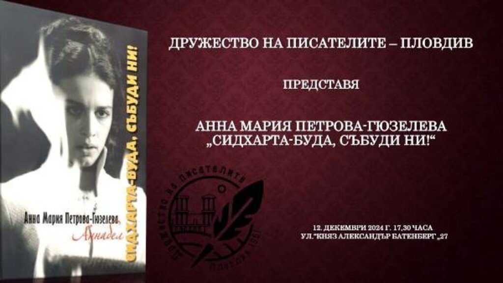 Премиера на новата стихосбирка на Анна Мария Петрова-Гюзелева ще се състои в Дружеството на пловдивските писатели от 17,30 ч. Книгата е озаглавена „Сидхарта-Буда, събуди ни“. Поетесата, журналистка и актриса ще бъде представена от модератора на събитието Живка Аджеларова.