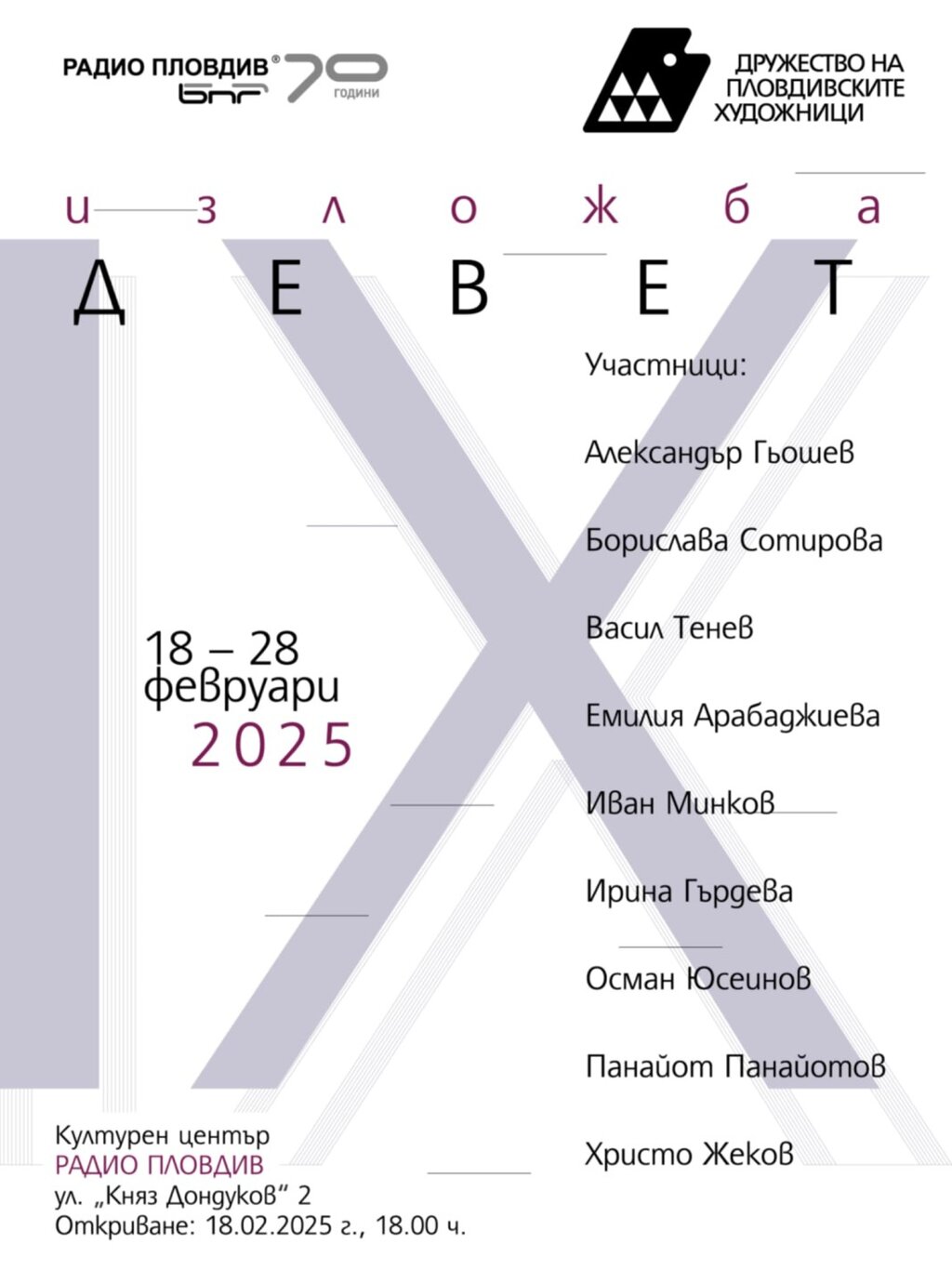 Изложбата „ДЕВЕТ“ се открива днес на 18 февруари в Културния център на Радио Пловдив. В нея картините си ще покажат художниците Александър Гьошев, Борислава Сотирова, Васил Тенев, Емилия Арабаджиева, Иван Минков, Ирина Гърдева, Осман Юсеинов, Панайот Панайотов и Христо Жеков.