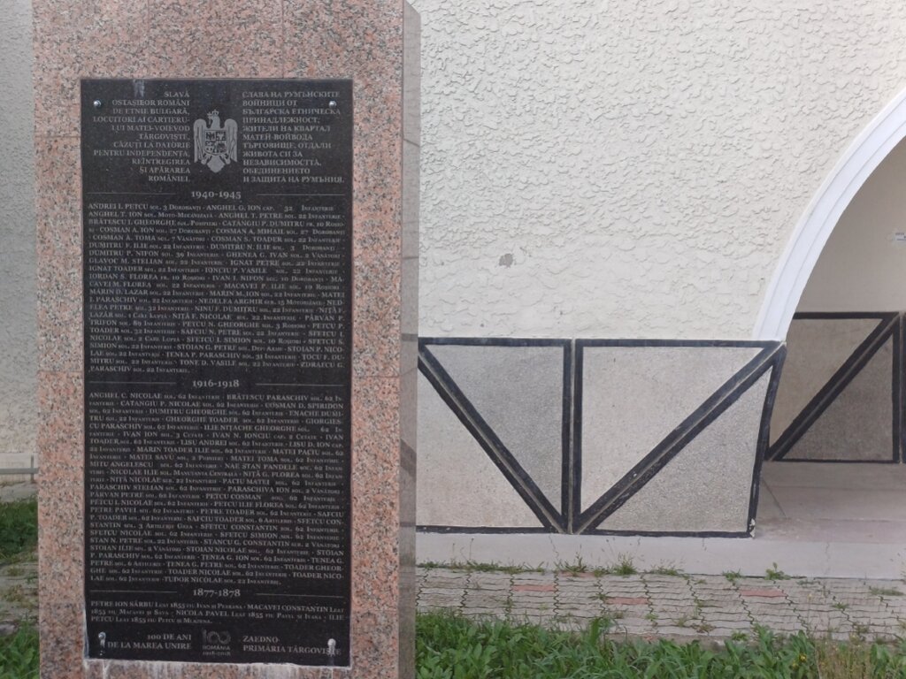 Българите в Търговище проявяват и силен румънски патриотизъм, осъзнавайки, че "тяхното благоденствие е и благоденствието на Румъния, нацията, в която се опитваха да се интегрират". Те участват с хора и продукти във войните от 1877 г. насам. Днес пред културния център на квартала, където се намира и музея на българите от Търговище има два паметника. Единият изписва имената на семействата, които полагат основите на квартала след преселването си в Търговище от Бълени. Другият е паметник на жертвите, които българската общност в града е дала във войните след 1877 г. Българите от Търговище са наясно със своя принос за Румъния – в мирно и във военно време, и за тях българската идентичност съжителства с принадлежността им към румънското общество и държава.