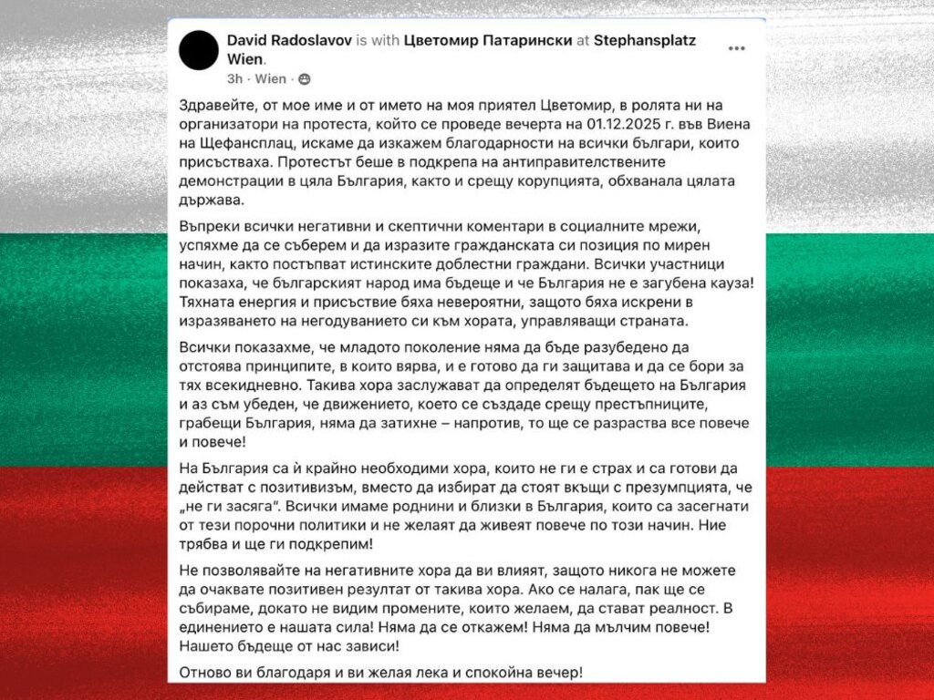 Давид не просто е присъствал на гражданската акция на наши сънародници във Виена, но той е неин организатор заедно със Цветомир Патарински. Решението за това дошло спонтанно. След протеста в България на 26 ноември и отказа Бюджет 2026 да бъде оттеглен двамата очаквали някой друг сред нашата общност в Австрия да организира подобна демонстрация. Това обаче не се случвало и Давид взел нещата в свои ръце – за няколко дни заявил и получил нужните разрешение и обявил протест в защита на правата на "българите в страната им, техният глас да бъде чут и бюджетът да бъде изтеглен. Корупцията да спре и овладяната държава да не си позволява повече да съсипва животите на хората".