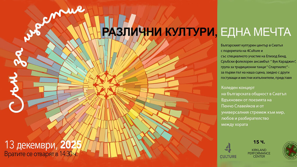 Българският културен център в Сиатъл, с подкрепата на 4Culture, кани за Коледен концерт на българската общност в града. Събитието е наречено "Различни култури, една мечта" и е вдъхновено от поезията на Пенчо Славейков и от универсалния стремеж към мир, любов и разбирателство между хората.