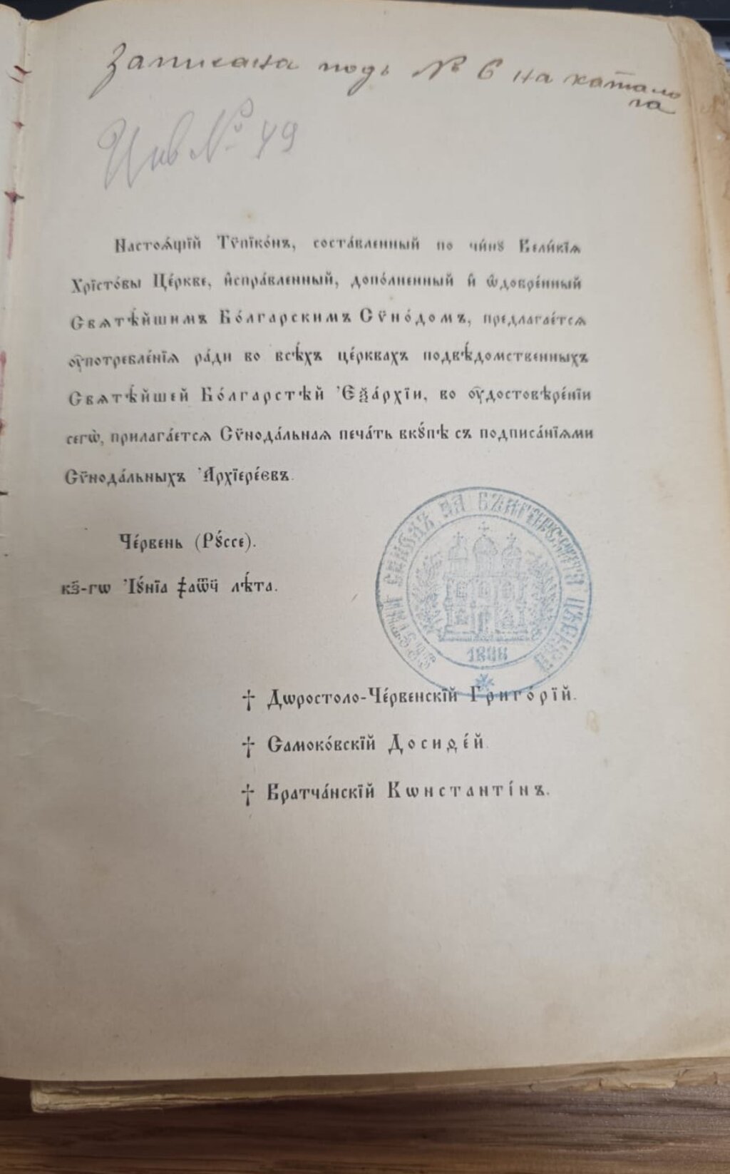 Документът е осветен от Григорий Доростолски и Червенски, виден български духовник и църковен деец от XIX век, от Доситей Самоковски, български духовен водач и митрополит от периода на Османската империя, известен като Митрополит Доситей Самоковски, Константин Врачански (Константин Попдимитров Малинков), виден български православен духовник от края на XIX и началото на XX век.