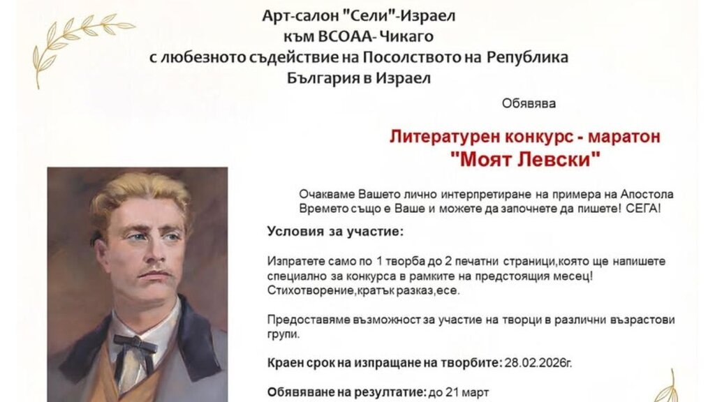 До края на февруари се приемат творби за литературния конкурс "Моят Левски", организиран от Арт-салон "Сели" – Израел към Конфедерацията на българските организации и дейци в чужбина (ВСОАА) – Чикаго, със съдействието на Посолството на България в Израел. Конкурсът кани участници от различни възрастови групи да представят свое лично интерпретиране на примера и делото на Васил Левски. Допускат се стихотворения, кратки разкази или есета, написани специално за инициативата.