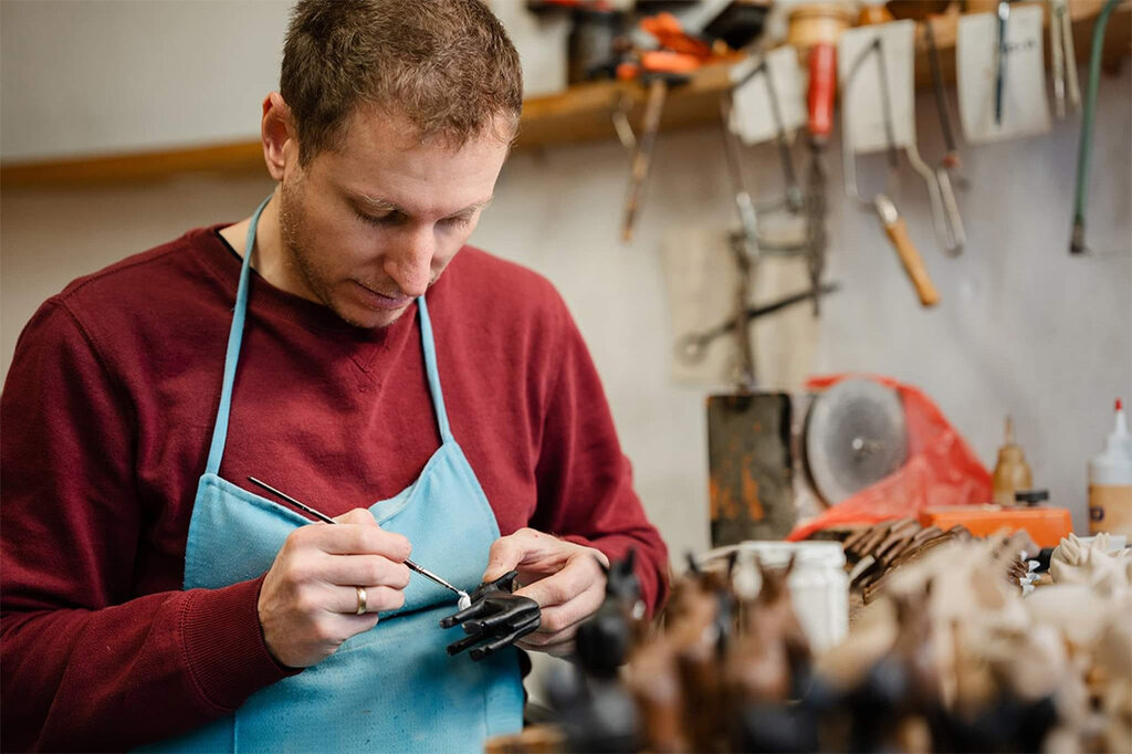 Ние не предлагаме изделия в интернет, само тук на чаршията могат да ни намерят хората и дори да наблюдават как се правят нещата от дърво. Не използваме машини, всичко се прави на ръка с традиционните инструменти – длета, козя ножка, резбарски нож. Използваме и много стара техника за допълнително оцветяване на дървото. Чрез нагаряне с пирограф, уред с който се изгаря повърхността на дървото по желания от нас начин и отгоре се поставят байцове на водна основа. Това е безвредна техника за оцветяване, така че дървените фигурки могат да се използват и като играчки за деца."