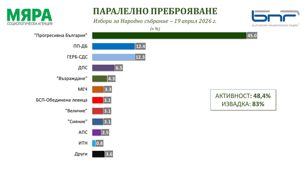 Резултатите от паралелното преброяване на социологическа агенция "Мяра" – един от двата партньора на БНР при отразяването на вота, при 83% извадка показват следните резултати за изборите за 52-о Народно събрание: