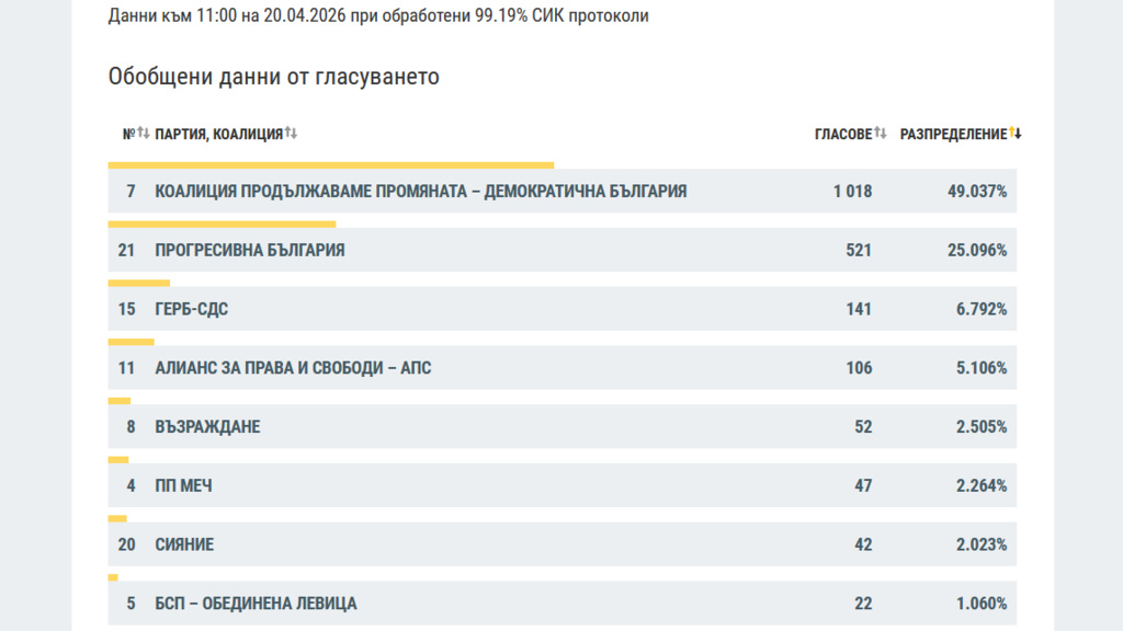 "Продължаваме промяната – Демократична България" има най-добър резултат от гласуването на 19 април в петте избирателни секции в Сърбия, става ясно при почти 100% обработени протоколи. Изненадващо "Алианс за права и свободи" печели в секцията в Босилеград, предава кореспондентът на БНР в Кюстендил Кирил Фалин.