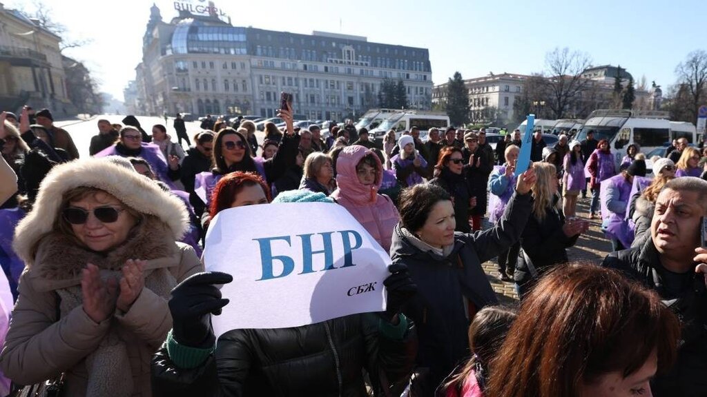 Синдикално протестно "студио" временно затвори движението по бул. "Цар Освободител" в центъра на София с призив за увеличение на заплащането в трите обществени медии - БТА, БНР и БНТ.