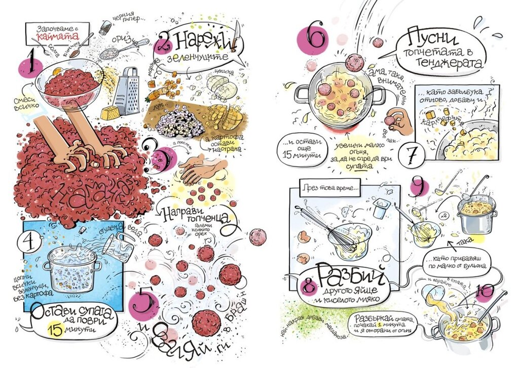 „Готварска книга за големи деца“ събира 14 рецепти в категория „Солено” и още толкова в „Сладко и закуски”, като указанията за готвачите са под формата на комикс.