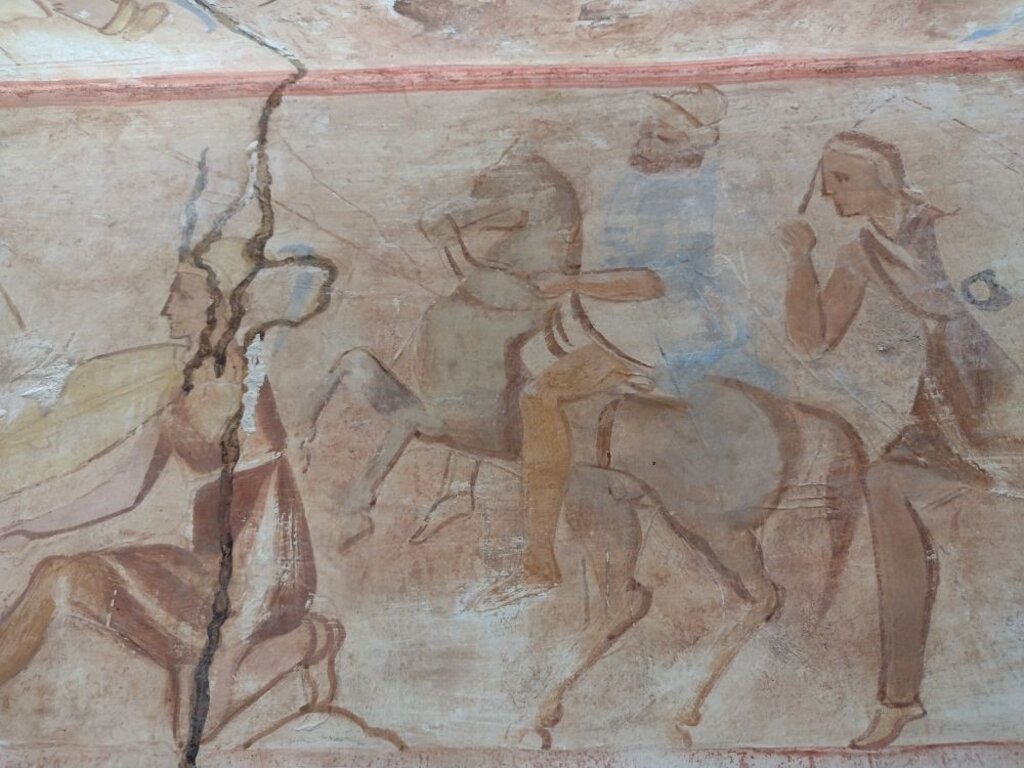 Най-забележителното в последния дом на погребаната царска двойка са изразителните стенописи. В тесния дромос, на височината на очите на преминаващия под наклонения свод, са изрисувани динамични бойни епизоди. Те пресъздават военните подвизи в земния път на одриския владетел. Сцените въвеждат към централните фрески под купола на гробната камера.