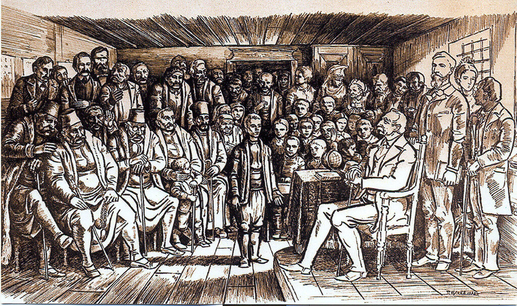 Examen public în școala din Gabrovo la sfârșitul anului școlar (Petrovden). Elevii își demonstrează cunoștințele, iar cei mai buni elevi primesc în dar o carte.