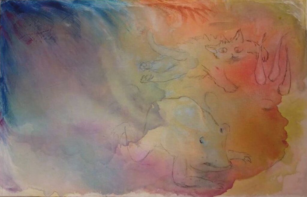 ”Este o modalitate de a inversa procesul de reprezentare – în loc să pornesc de la o idee, încep cu o formă aleatorie care rezultă din vărsarea vopselei acrilice pe apă cu un tip special de diluant”, spune Mariangela Anastasova. "Eu însămi sunt surprinsă, pentru că se întâmplă atât de multe lucruri – ele se schimbă constant și, în practică, intru în dialog cu aceste bălți de vopsea. Iar rezultatul este mult mai interesant decât dacă aș fi dictat eu însămi subiectul."