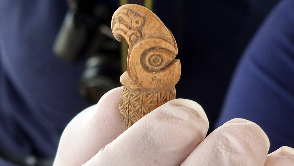 Длина скипетра составляет 39 сантиметров, а его рукоять сделана из двух отдельных костей, склеенных друг с другом.Соединение между головкой и рукоятью скипетра выполнено очень точно. Если смотреть с одной стороны, он похож на клюв орла, но с другой, древний мастер вырезал антропоморфное изображение, на котором клюв выглядит как шляпа.