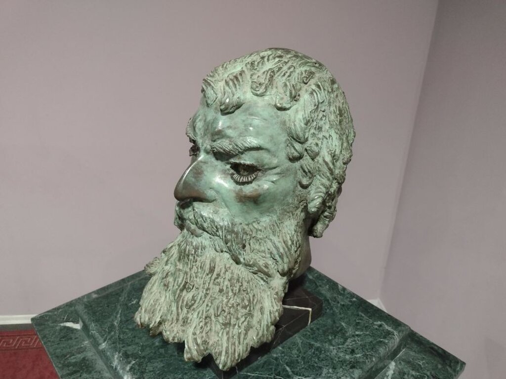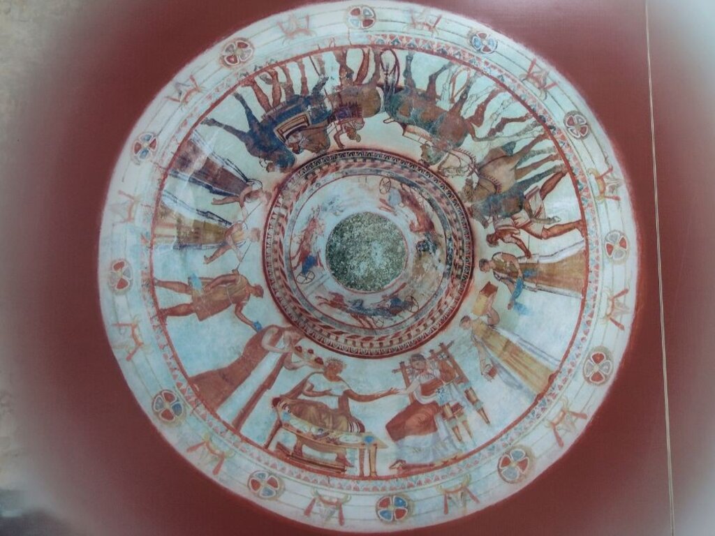 Посетитель поднимает взгляд на камень, покрывающий толос или купольный свод. Над всей этой суматохой по кругу летят три колесницы. Это погребальные игры-соревнования, устраиваемые в память скончавшегося. Жизнь и смерть. Перед глазами "оживают" люди 23-вековой давности.