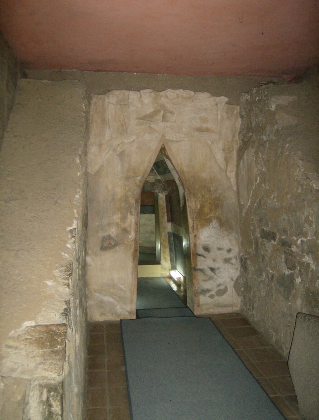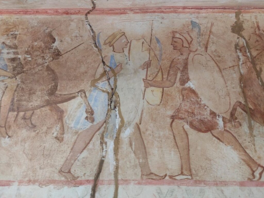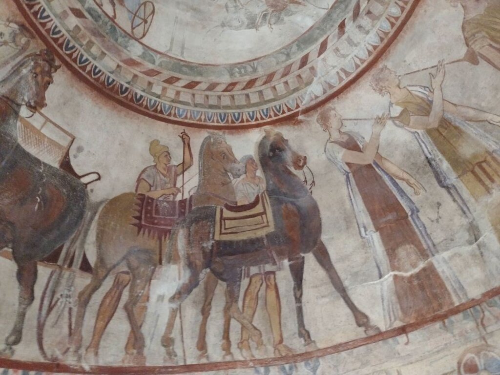 Самое примечательное в последнем доме похороненной царской четы – это выразительные росписи. В тесном дромосе, на уровне глаз проходящего под наклонным сводом, написаны динамические батальные сцены. Они пересоздают военные подвиги во время земного пути владетеля Одрисского царства. Сцены вводят к центральным фрескам под куполом погребальной камеры.