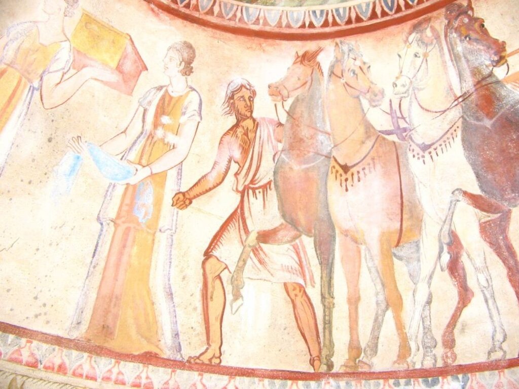 Конюхи тянут оседланных любимых жеребцов владетеля. Животные чувствуют, что скоро будут принесены в жертву. Больше всего нервничают кони, запряженные в квадригу. Возница с развевающимися волосами еле сдерживает их. Это последний миг….