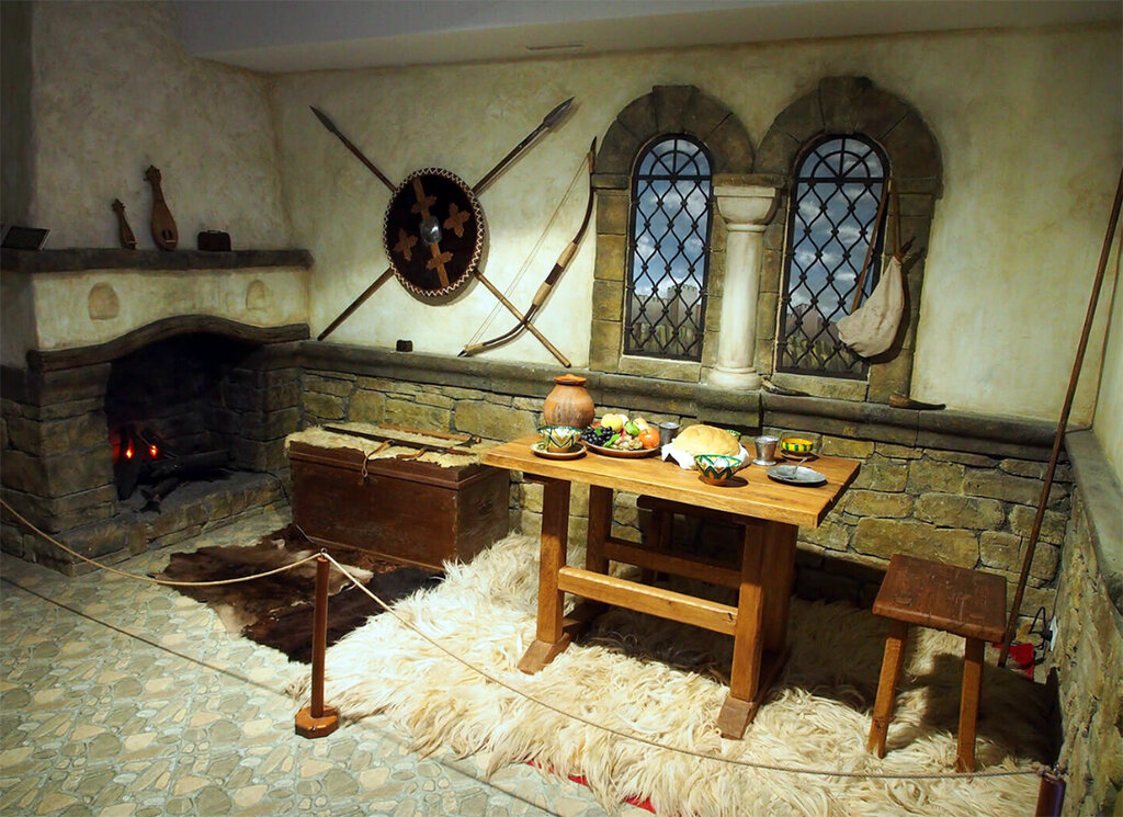 Прогулка в нашем Мультимедийном центре начинается с частью жилого дома, обитаемого самой бедной прослойкой тогдашнего населения. Так выглядел обычный дом, устроенный в рамках крепости. Все могут увидеть, насколько скромным был тогдашний быт. Вся семья спала рядом на одной большой кровати. Люди в те времена, в основном, развивали сельское хозяйство. Трапеза не была слишком богатой, и на ней весьма редко присутствовало мясо, например.